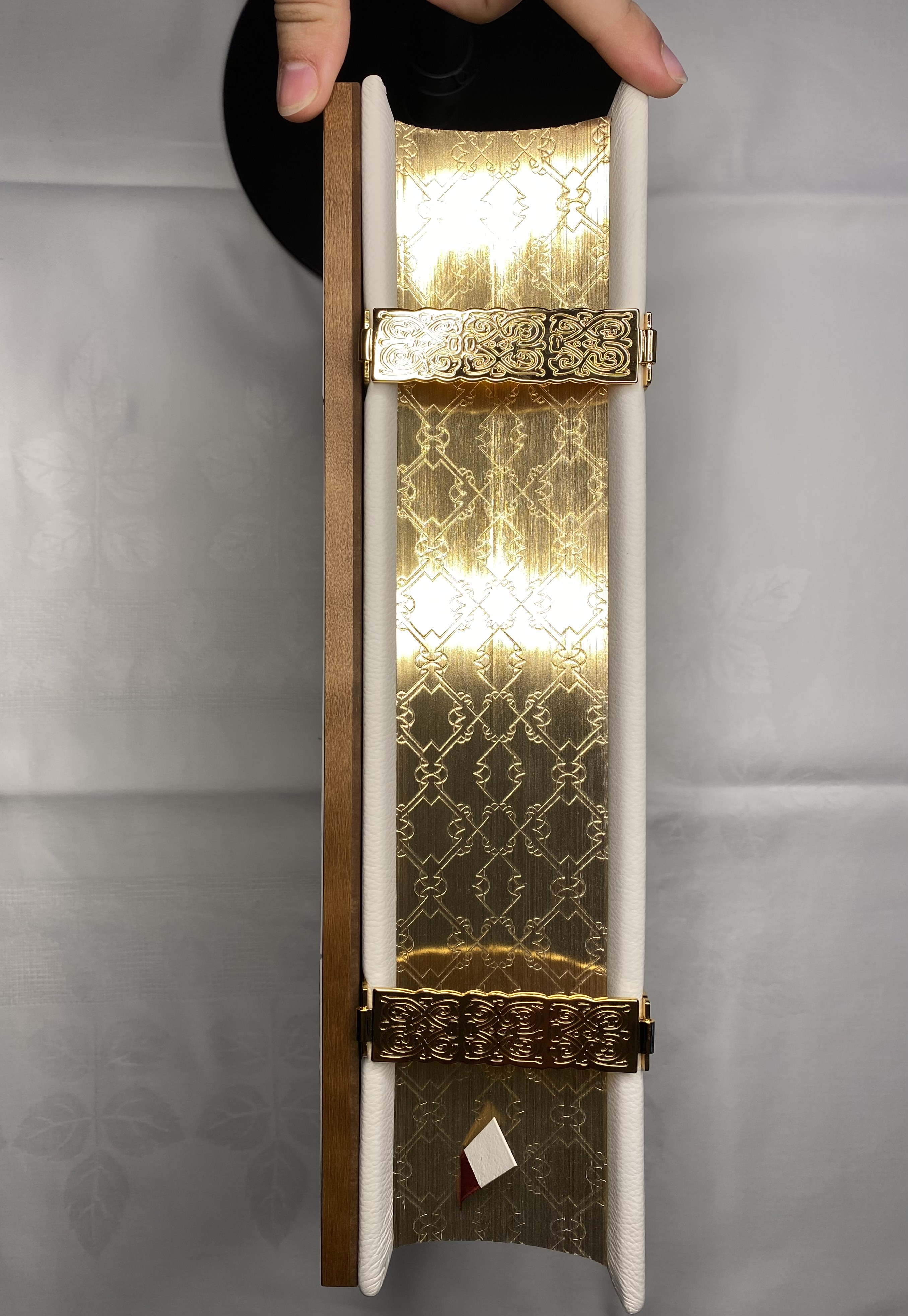 270 der Illustrationen sind mit echtem Blattgold versehen. Der Einband aus echtem Leder trägt ein abnehmbares, rubinbesetztes Kreuz sowie vergoldete Buchschließen.